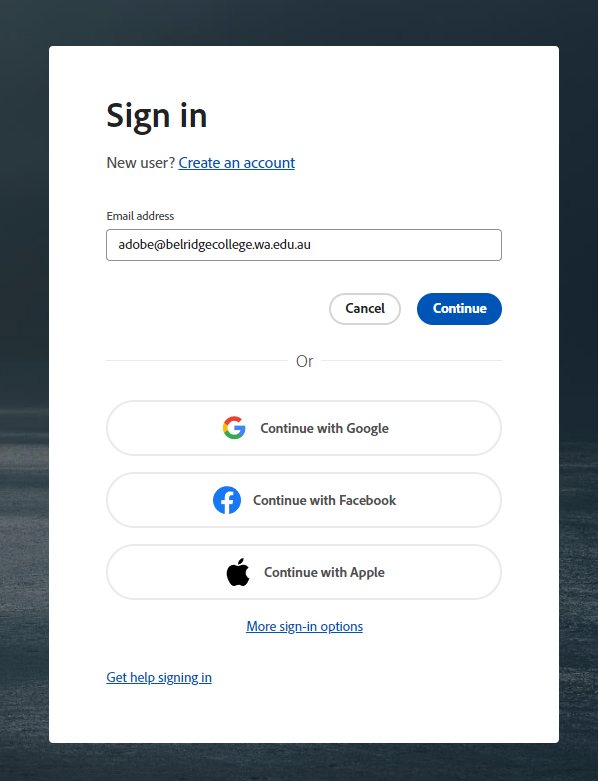 When signing into Adobe Creative Cloud do not login using your student email address, Adobe needs to know you are signing in from Belridge Secondary College: