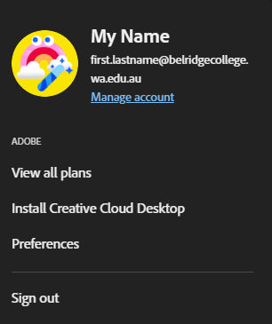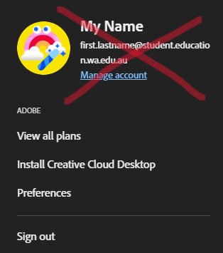 If you have incorrectly logged into Adobe Creative Cloud using your student email, you will need to sign out of Adobe cloud and then sign back in following these instructions.